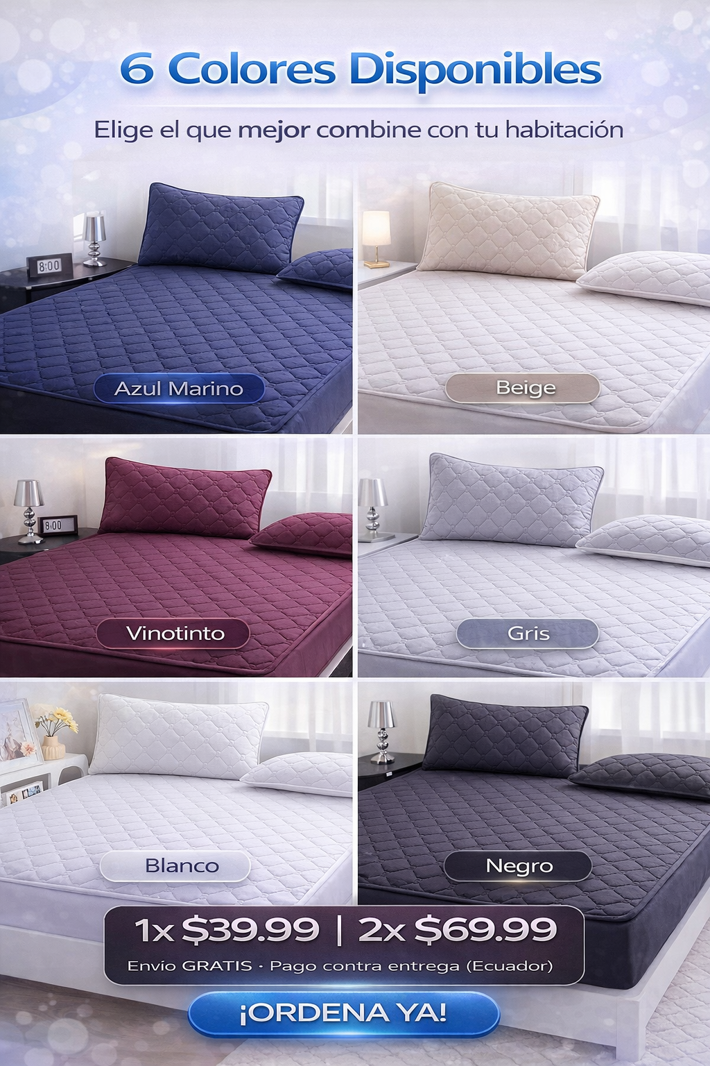 Tenemos 6 colores disponibles: Azul marino, Beige, Vinotinto, Gris, Blanco y Negro. Puedes elegir el que mejor combine con la decoración de tu habitación.